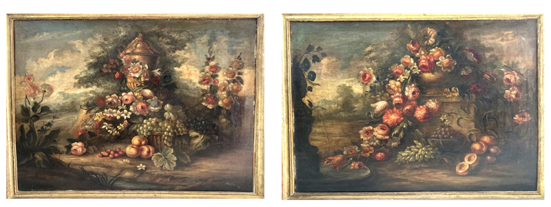 Pair 18thC. Oil Paintings Still Life of Fruit and Flowers