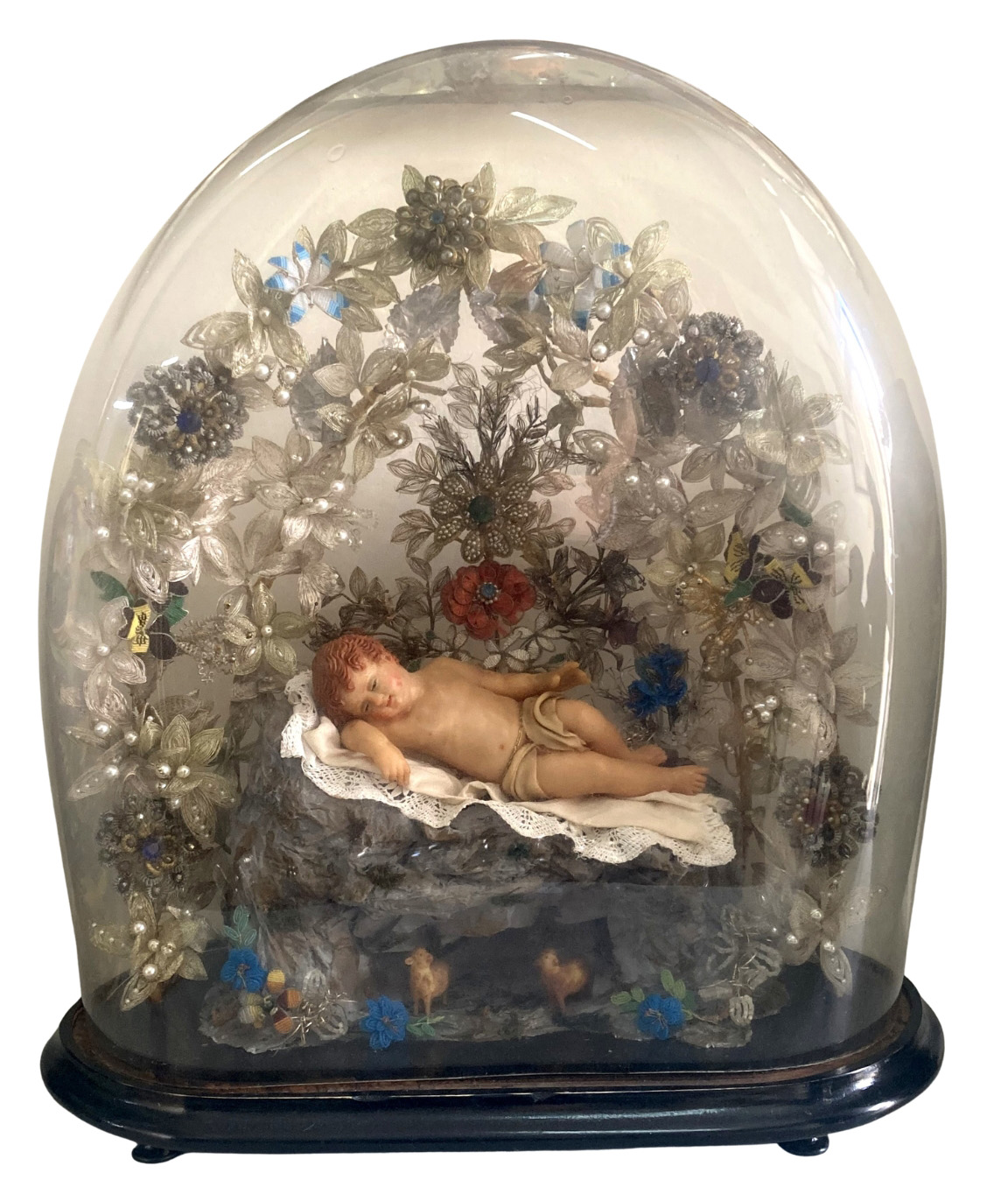 19thC. Wax Baby Jesus with Ganutel Flowers under A Glass Dome |