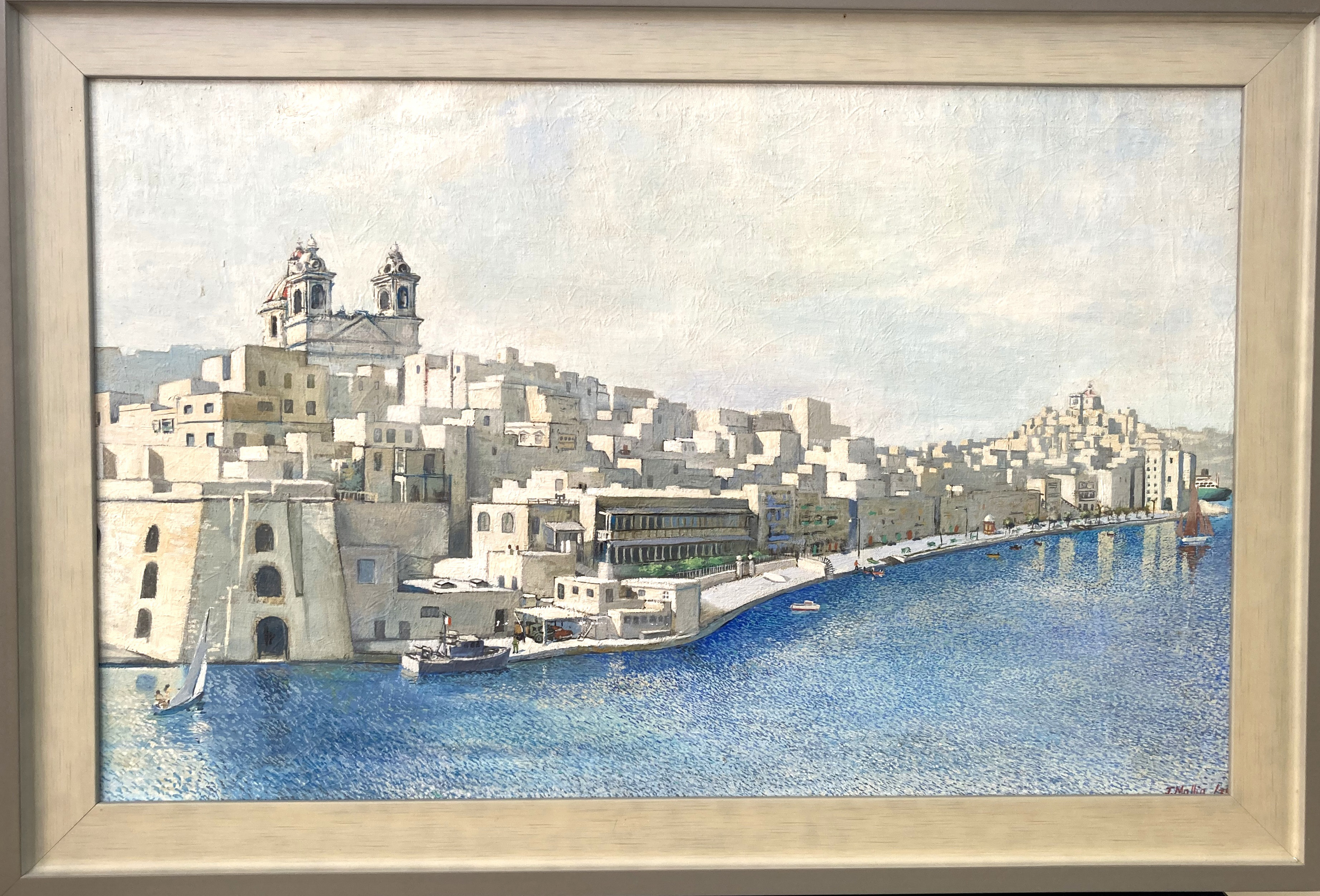 J.Mallia 1971 Oil Malta Harbour Scene |