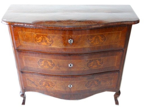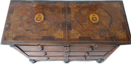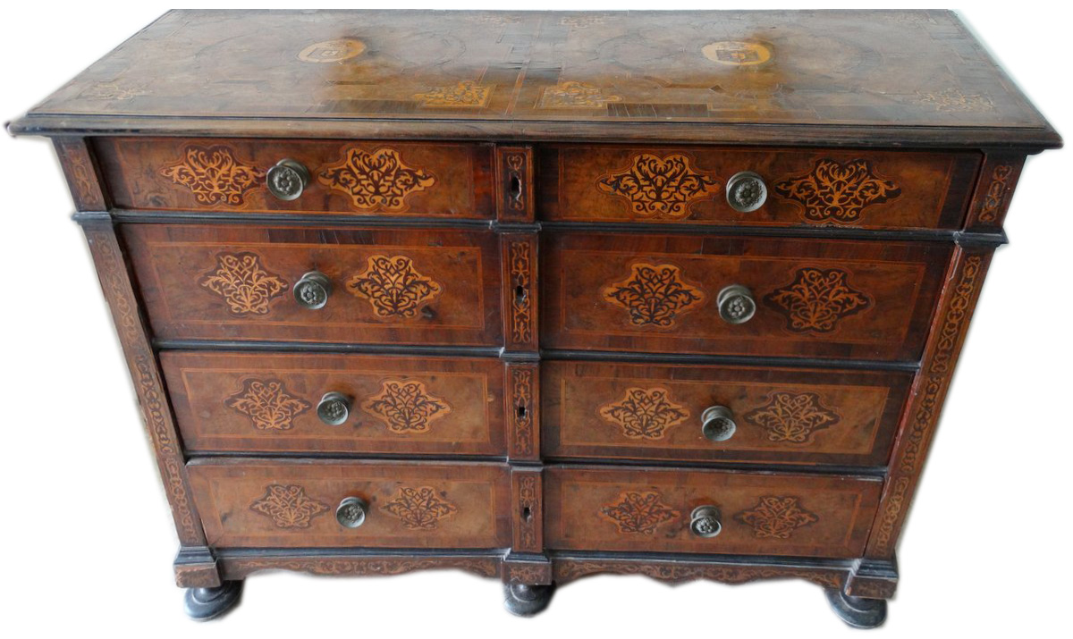 17thC. Maltese entirely veneered with olive wood and inlaid with orange wood medallions decorated with walnut lacework and resting on five bun feet |