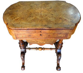 Victorian inlaid walnut workwriting table on stretcher support |