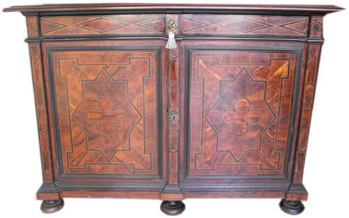 18thC. Maltese Cupboard entirely veneered in olive wood and inlaid with a geometric star pattern on 5 bun feet