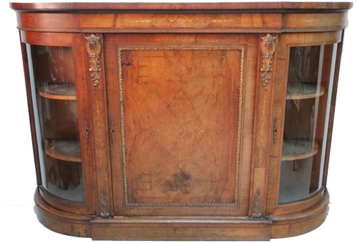 Victorian inlaid walnut bowfront cabinet with glazed side doors |