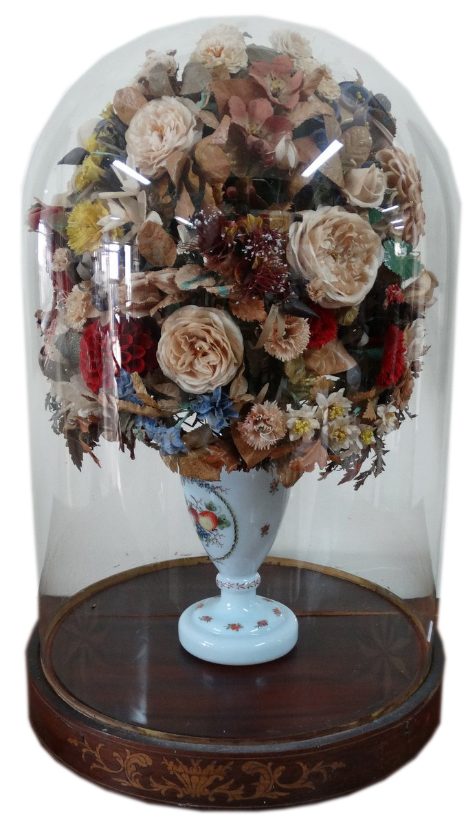 Antique glass vase with flowers under a glass dome |