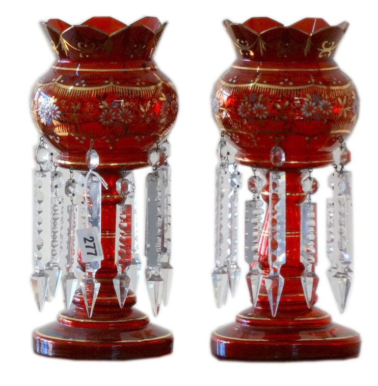 Pair antique red double row lustres with drops
