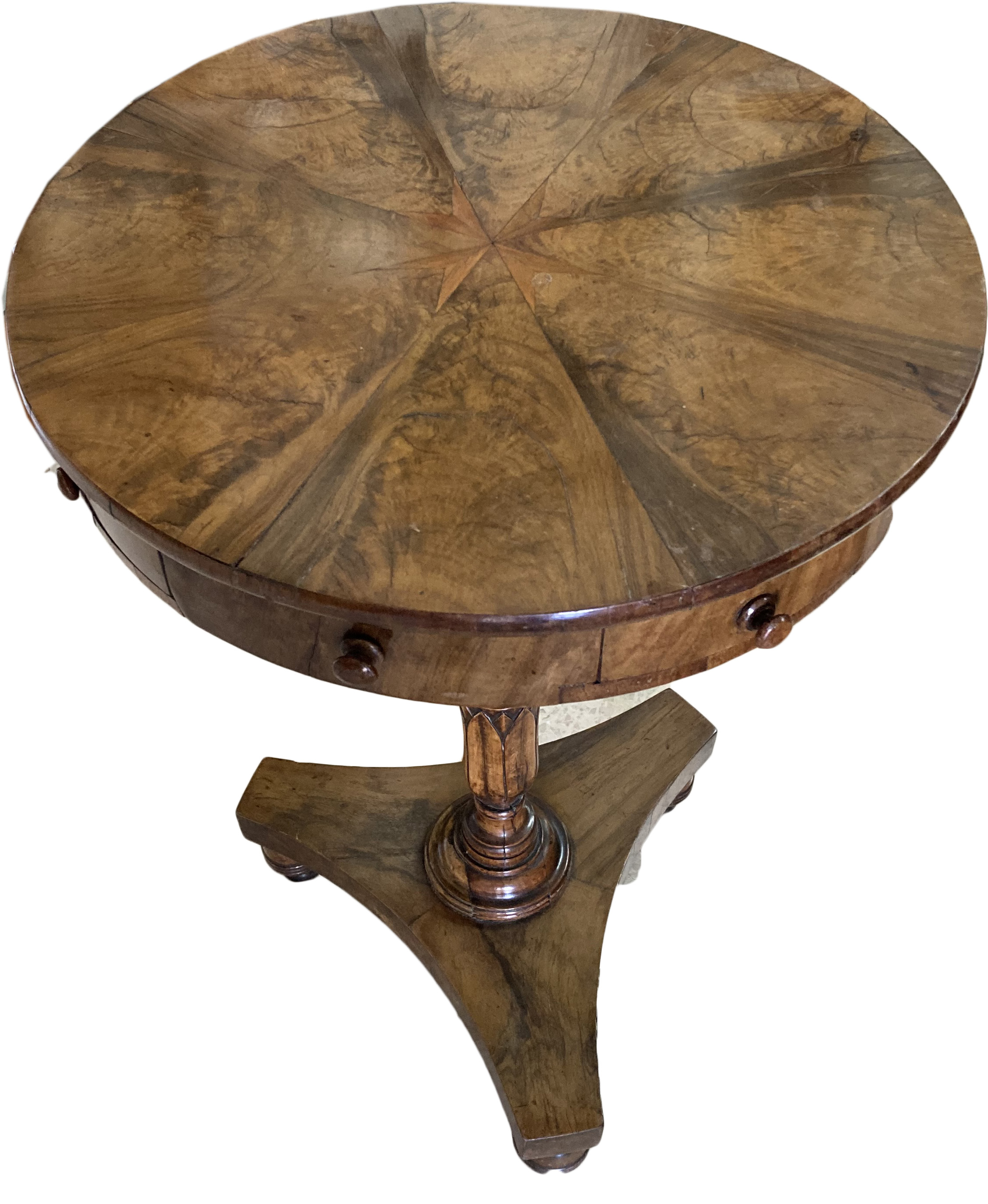19thC. Maltese Olivewood Drum Table on Tulip Columns