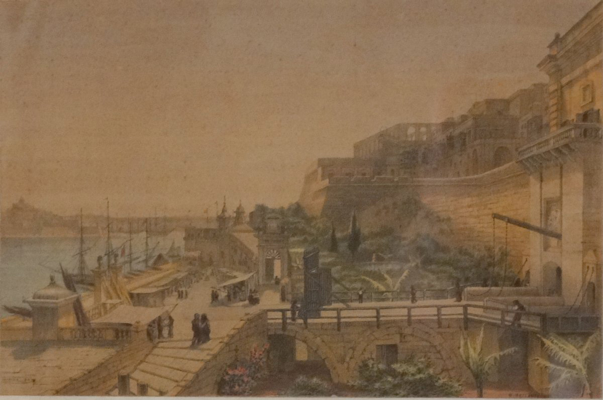 M.Bellanti coloured lithograph Porta Reale Fountain Valletta |