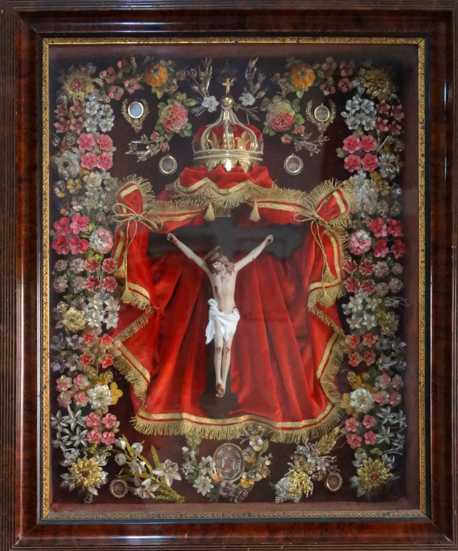 Antique Relic with Christ hanging on the cross ornated with ganutel flowers