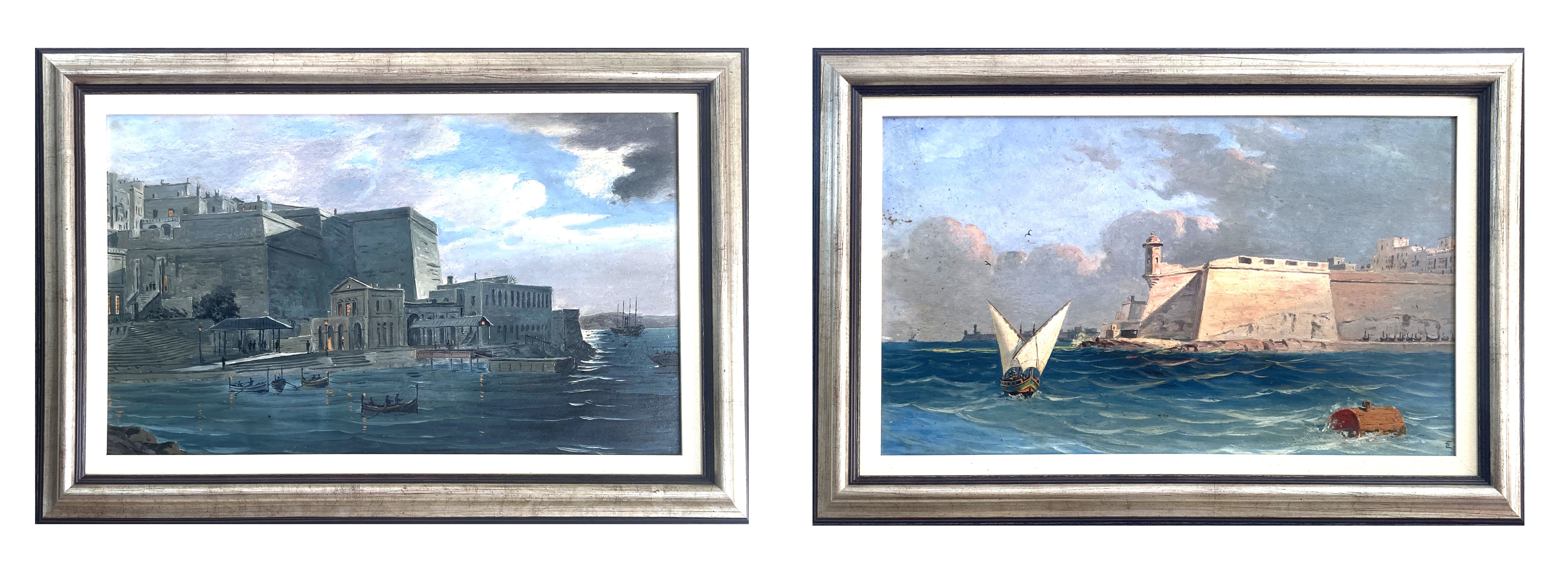 Pair Oil Paintings by Bonello Malta Harbour Scene