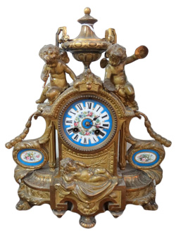 Antique French gilt mantelpiece clock with serve plaques
