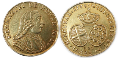 Emmanuel de Rohan gold 20 Scudi dated 1778 (front & back) & De La Vallette silver 4 Tari from the Restelli Collection (front & back) |