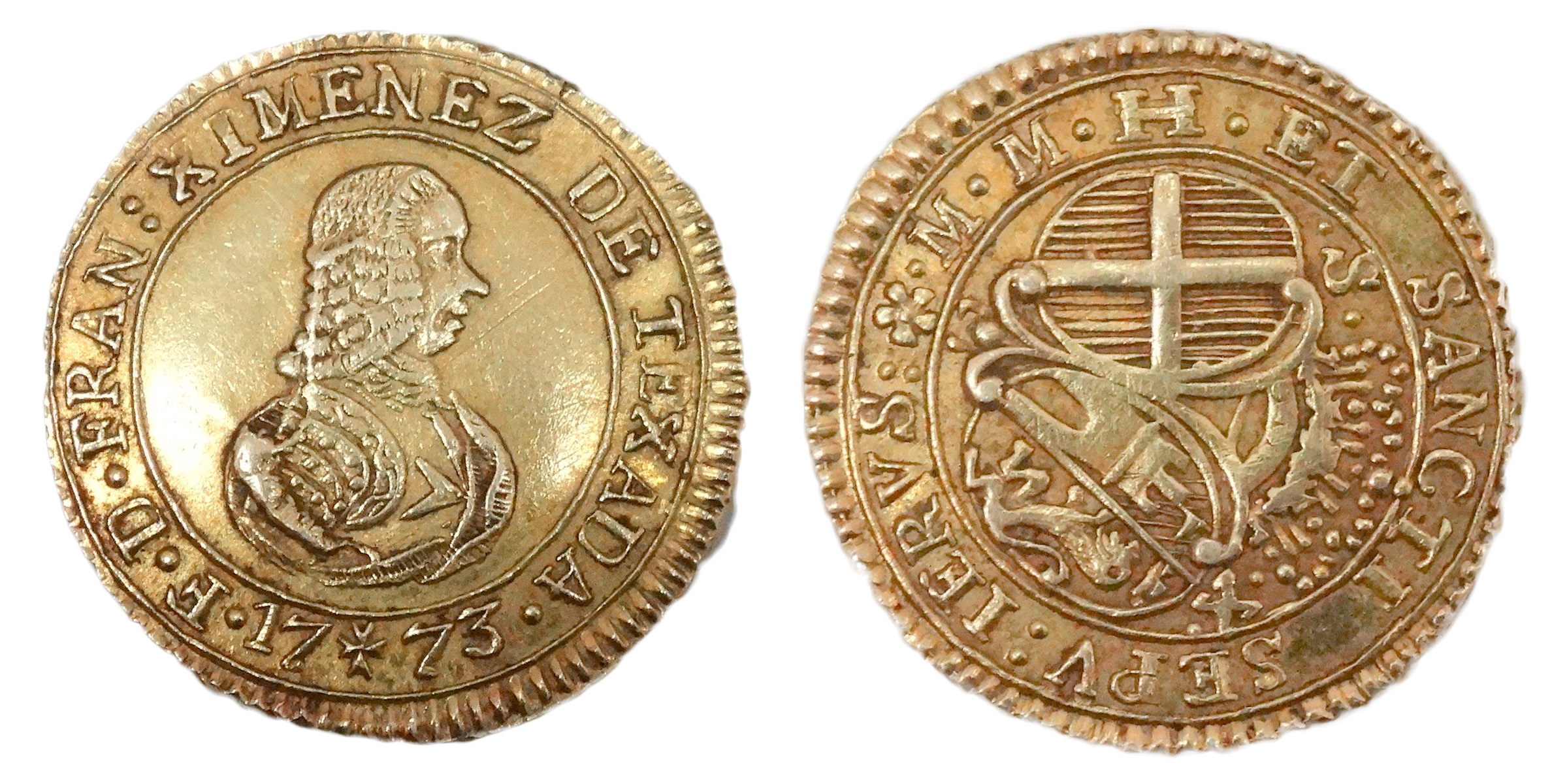 Francisco Ximenez De Texada gold 10 Scudi dated 1773 (front & back) & Emmanuel Pinto gold 2 Zecchini from the Restelli Collection (front & back) |