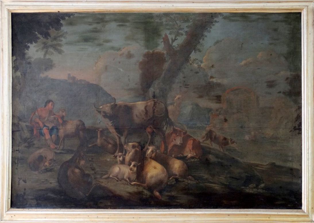 Large antique oil painting: Extensive Scene with shepherd and his Flock