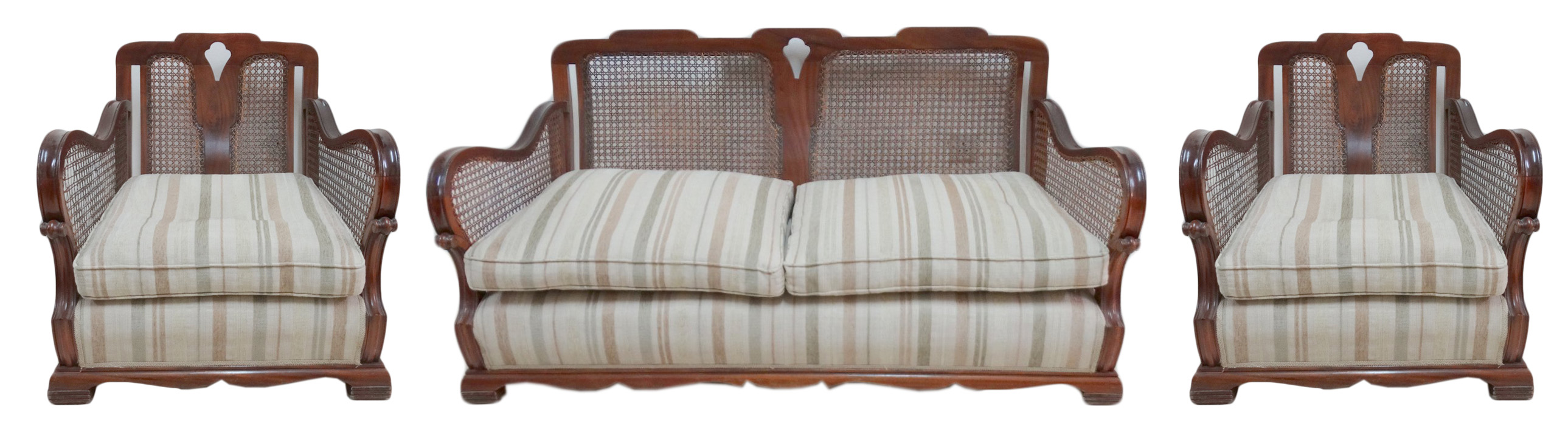 Pair mahogany Bergere armchairs & a Mahogany 2 seater Bergere