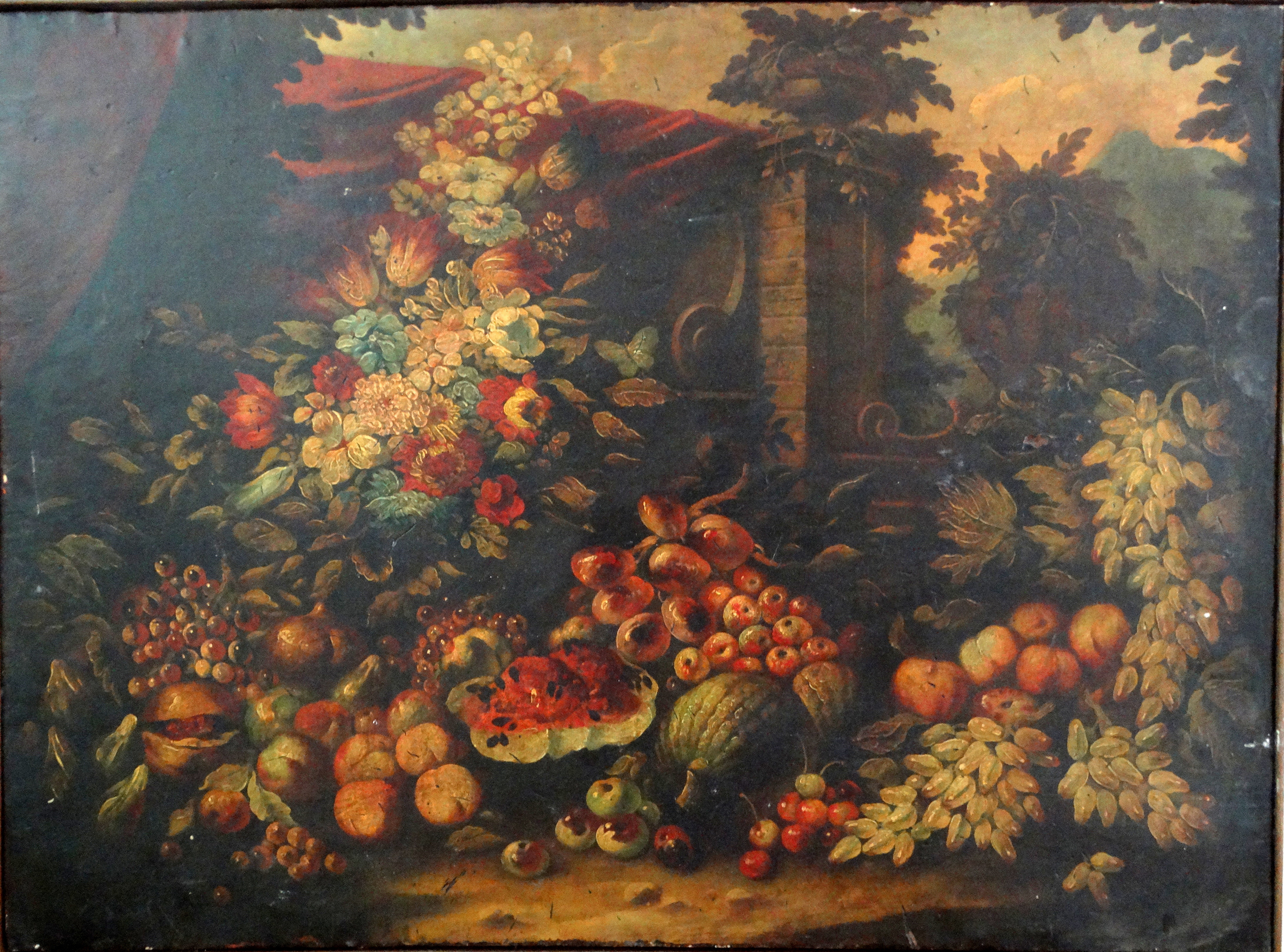 19thC. Oil Painting Still Life of Fruit & Flowers |