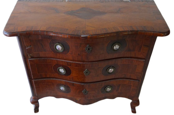 18thC. Maltese serpentine front chest of 3 drawers veneered in olive wood (SMALL PROPORTION