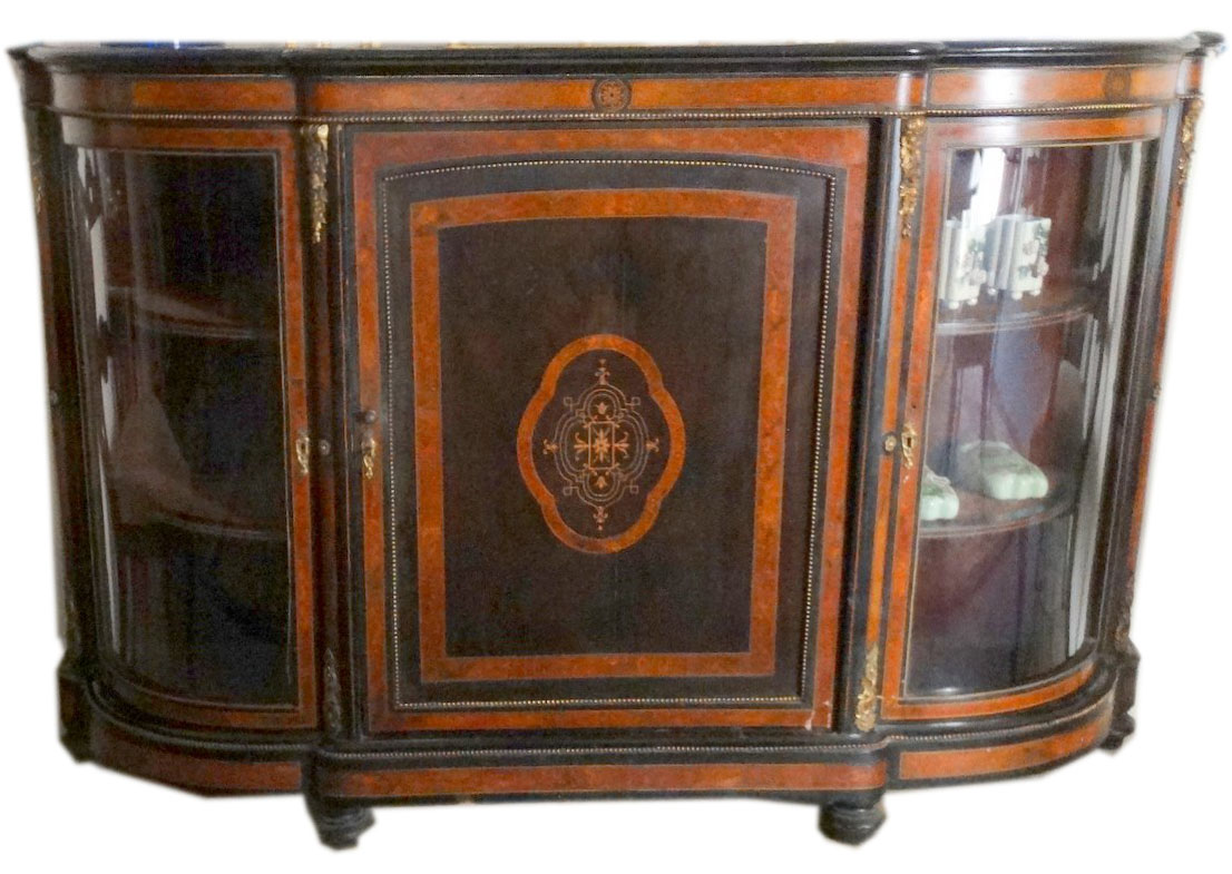 Victorian ebonised and satinwood bow front cabinet with shaped