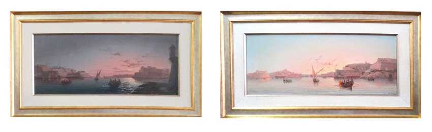 Pair L.M.Galea Oil Paintings Night & Day Harbour Scenes |