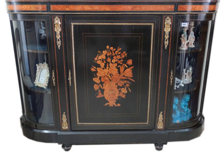 Victorian Ebonized & Satinwood Bow front Cabinet with shaped glass side doors